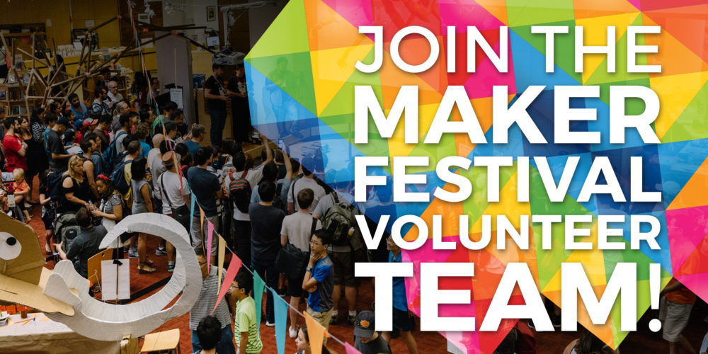 [space 20] There are plenty of fun and rewarding volunteer opportunities at Maker Festival: Greet attendees, assist with installing exhibitions, assist with workshops, and more! This is your chance to share your talents, learn cool things, AND have fun while…