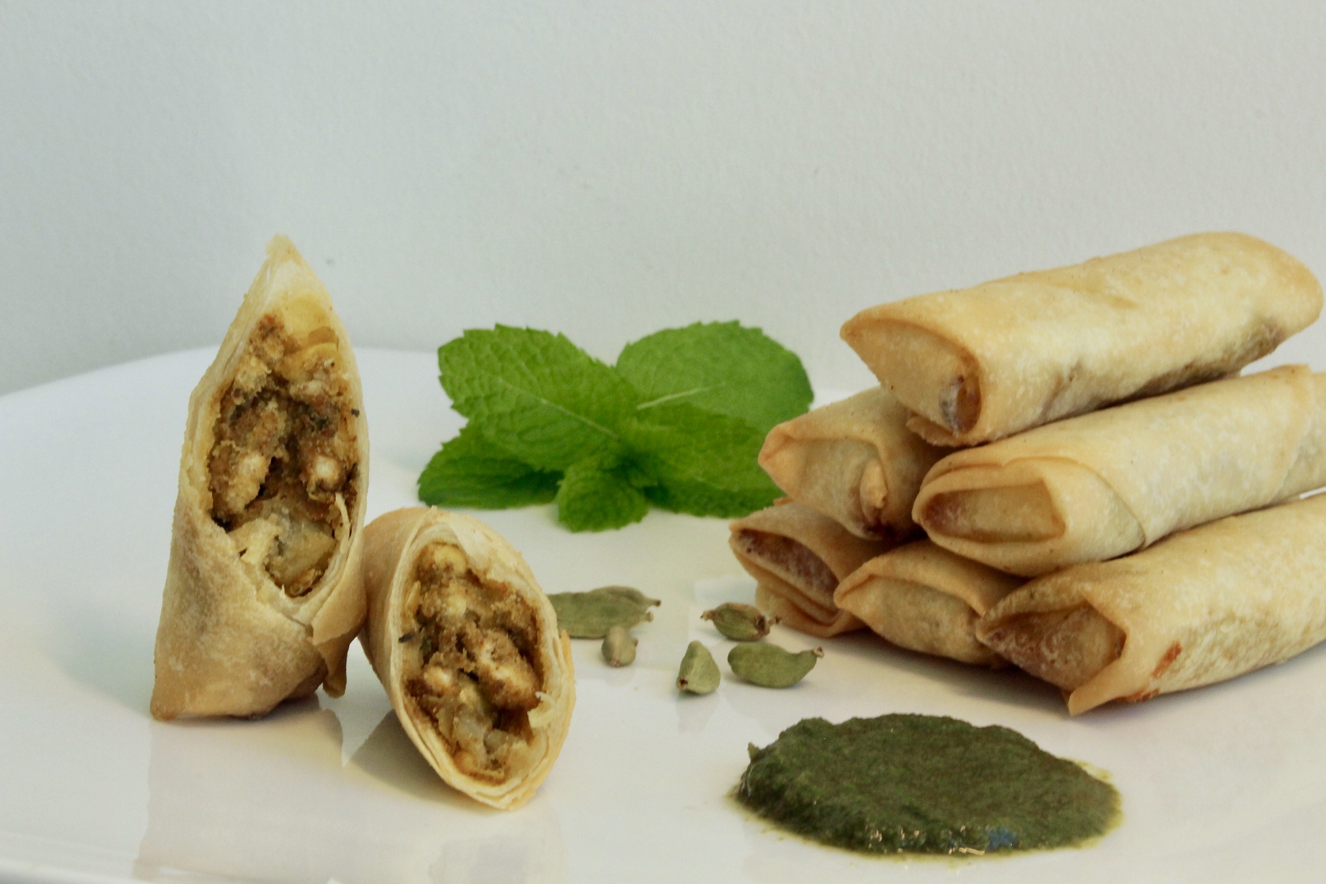 5. Indi Rôllies (chicken, potato, tomato, carrot, green peas, coriander, spices) dip in Mint Chutney Sauce