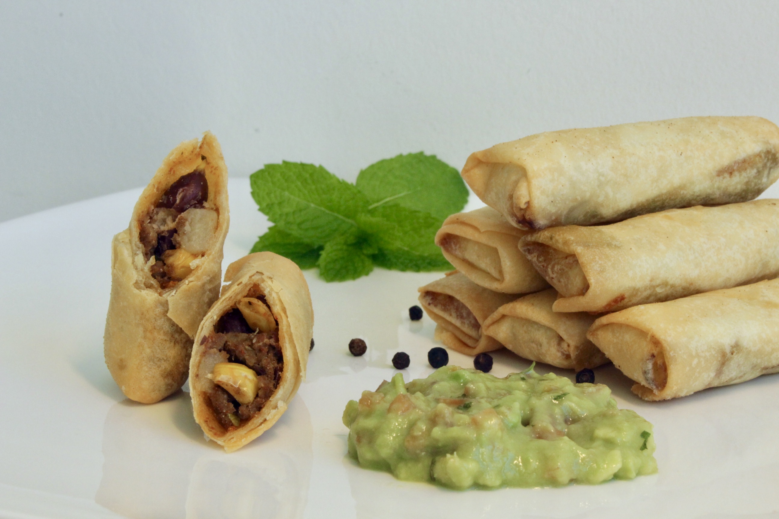 4. Mexi Rôllies (beef, corn, bell pepper, taco seasoning, tomato, red kidney beans) dip in Creamy Avocado Sauce